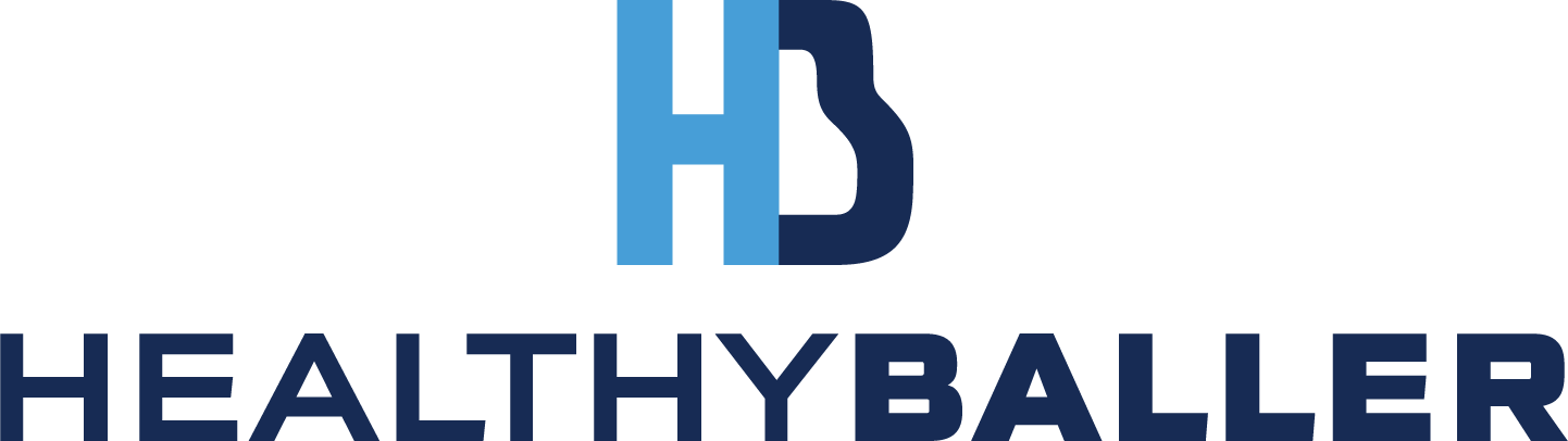 Logo with initials 'H' and 'B' in blue, with the words 'HealthyBaller' underneath.